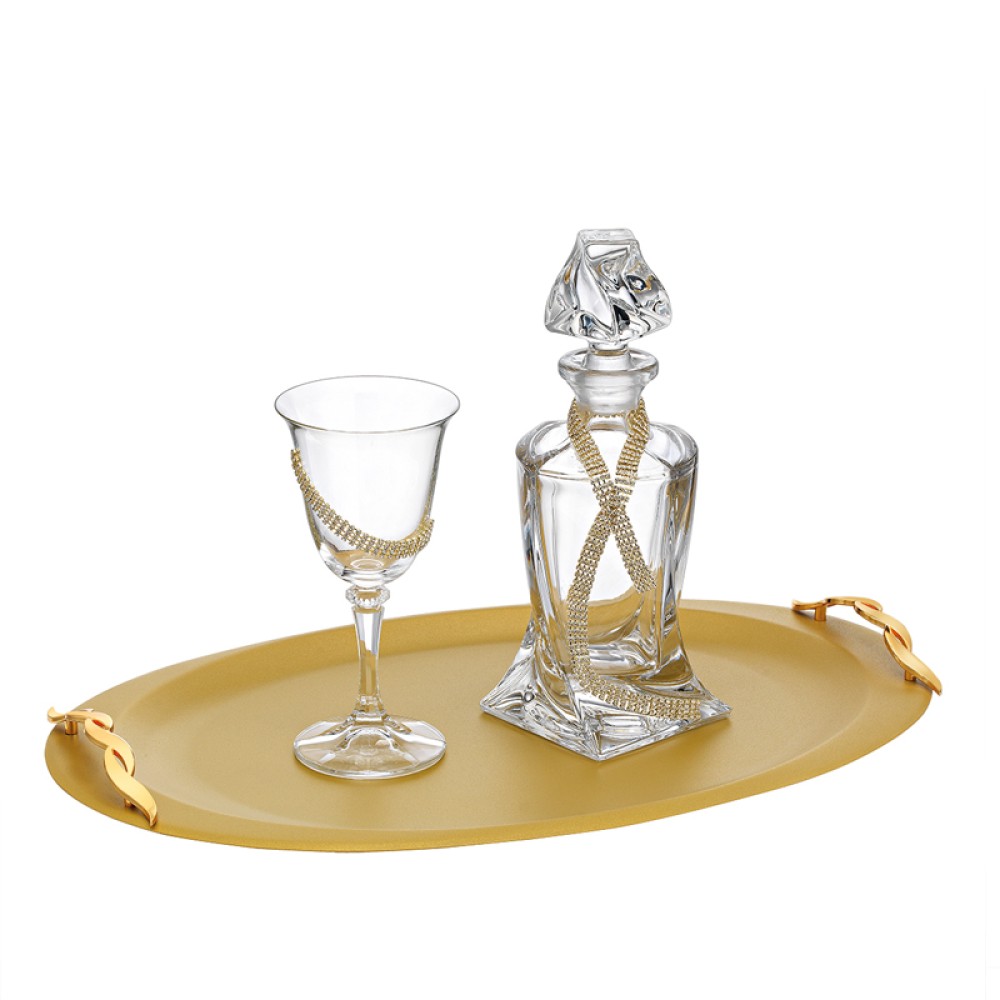 Κρυστάλλινη Καράφα: Διαθέτει ιδιαίτερο τετραγωνισμένο design με καμπύλες στη βάση και εντυπωσιακό πώμα. Είναι διακοσμημένη με μια χρυσή κρυστάλλινη κορδέλα που αγκαλιάζει το σώμα της.